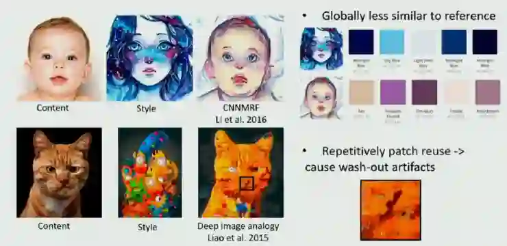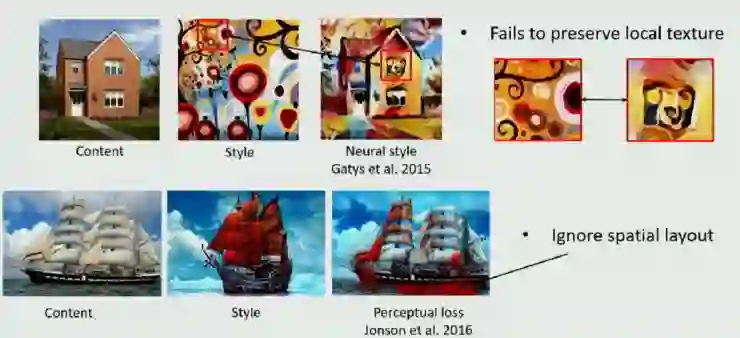 另一方面,non-parametric model 能够很好地保证 local 的结构,但是它很有可能没法保证对整体的模仿(上图中蓝色格调并没有迁移到婴儿身上),此外由于 local 的方法没有限制 patch 怎么使用,所有有可能导致某一两个 patch 被大量的使用(上面猫图中黄色 patch 被大量使用),最终产生一个 wash-out artifact。