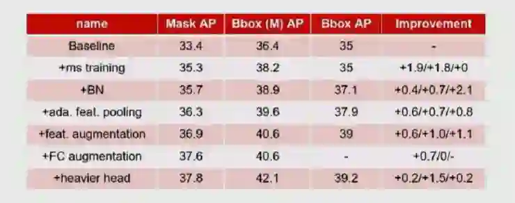 从这个网络中,仍然可以看出 FPNet 和 Mask-RCNN 的影子。其改进的地方是:(a)将 FPNet 的 backbone 做了一次 bottom-up 的增强;(b)在 FPNet 中每一个 scale 的 proposal 都是从对应的 scale 直接得来的,但石建萍他们发现事实上其他 scale 也将对该 scale 的 proposal 有很大帮助,因此他们加入了 adaptive feature learning 的模块;(c)在 Mask-RCNN 这一块,他们加入了 fully-connected fusion,这样可以保持更多的全局信息,使得 mask 有进一步的提升。