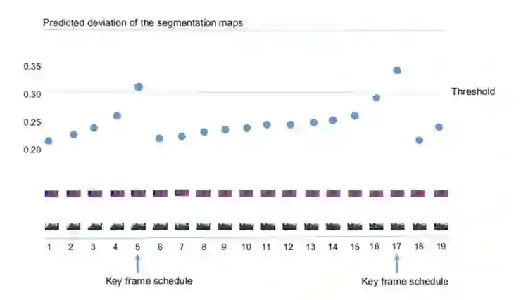 他们针对 features,设定一个 threshold,从而可以自动地选取关键帧。显然这里 threshold 值的大小也决定了计算的精度;事实上如果没有必要完全可以设置一个稍高的 threshold。此外,这种方式也可以动态地反映视频帧的变化,例如当场景变化较快时关键点也会较快地出现。