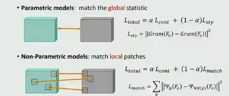 根据 style loss 的不同,大致可以将这些模型分为两类:一类是 parametric model,这类模型要求生成的图片 feature map 和要学的 style image 的 feature map 在整体上具有统计相似性;另一类是 non-parametric model,这类模型希望最后生成图片的 feature map 的 local patch 都是来源于 style image。所以可以说前者定义了 global 的相似性,而后者定义了 local 的相似性。