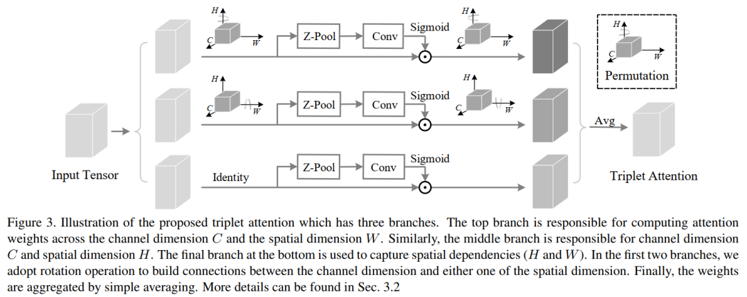 所提出的Triplet Attention见下图所示。顾名思义,Triplet Attention由3个平行的Branch组成,其中两个负责捕获通道C和空间H或W之间的跨维交互。最后一个Branch类似于CBAM,用于构建Spatial Attention。最终3个Branch的输出使用平均进行聚合。