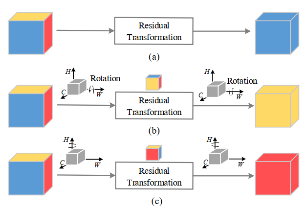 这里是通过三个分支分别捕捉输入张量的(C, H),(C, W)和(H, W)维间的依赖关系来引入Triplet Attention中的跨维交互作用。
