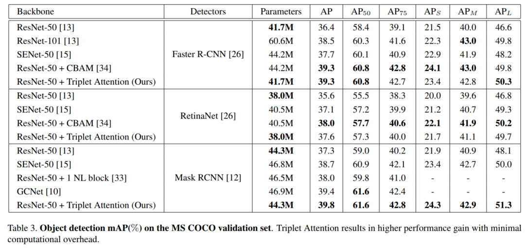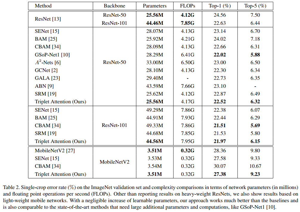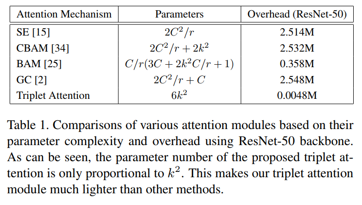 通过与其他标准注意力机制的比较,验证了Triplet Attention的效率,C为该层的输入通道数,r为MLP在计算通道注意力时瓶颈处使用的缩减比,用于2D卷积的核大小用k表示,k<<<C。