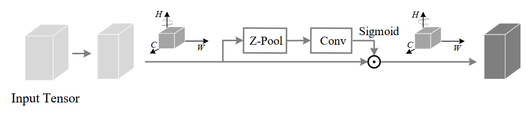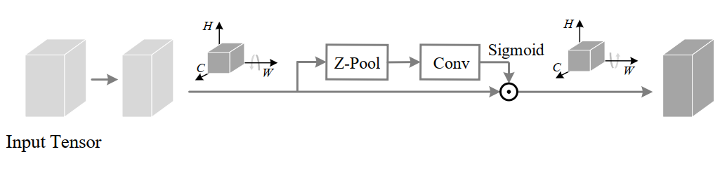 的通道通过Z-pool将变量简化为2。将这个形状的简化张量(2×H×W)简化后通过核大小k定义的标准卷积层,然后通过批处理归一化层。输出通过sigmoid激活层生成形状为(1×H×W)的注意权值,并将其应用于输入