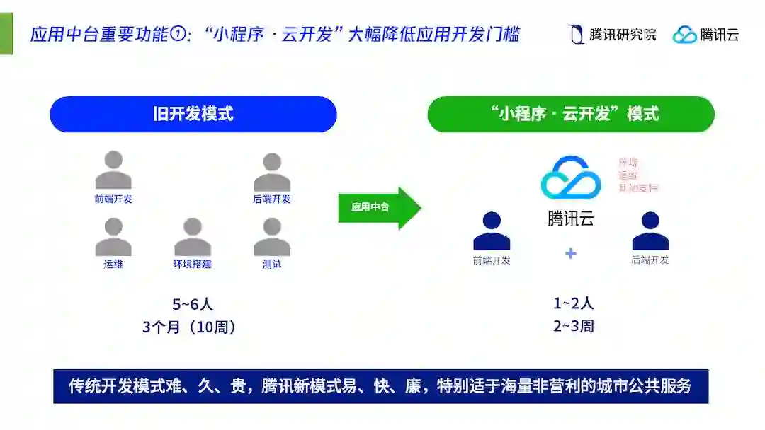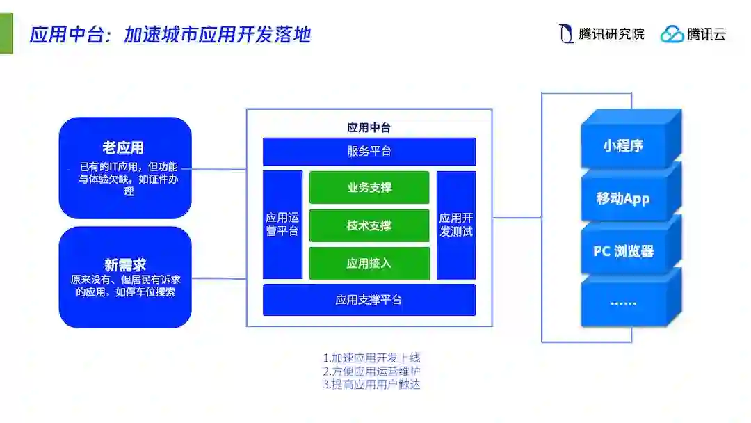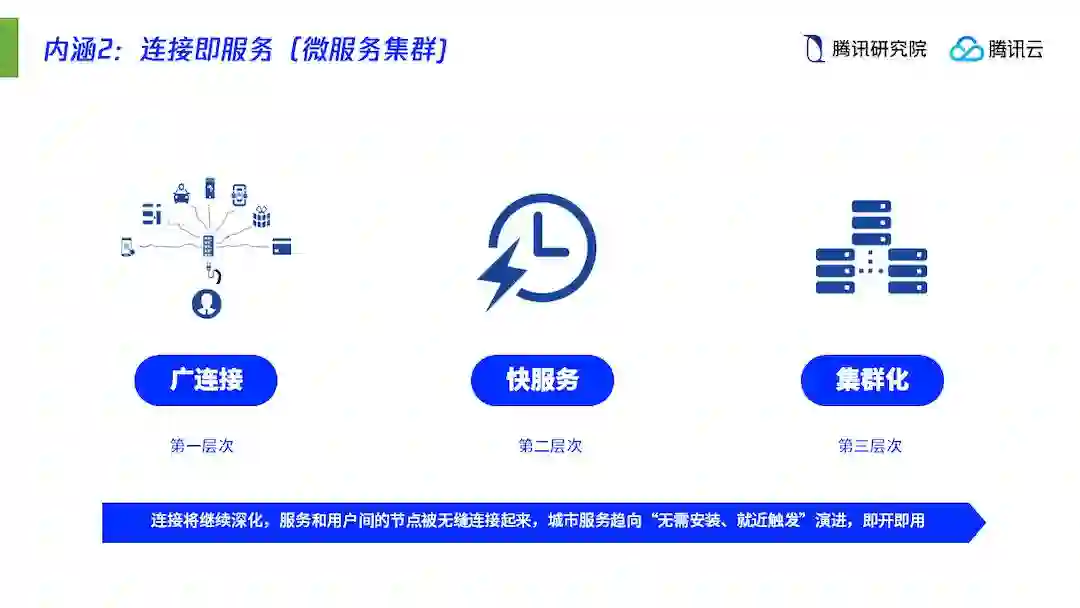 首先是从「 巨系统」到「 微服务」的价值转移。传统研究观点一直在强调智慧城市是「 复杂巨系统」,传统智慧城市建设思维也以建设大系统为价值指引,新的智慧城市则跳出了「巨系统」的思维框架,强调以「 海量微服务+综合移动入口」的微服务集群为主要特征,打造以数字技术为基因的城市「 微生态」。基于这一理念,越来越多的线下服务需要依照人的使用习惯和个性化需求重新设计,并通过独立APP、城市服务、小程序等多元的微端工具,快速触达到城市的每个场景、每个角落和每个人。