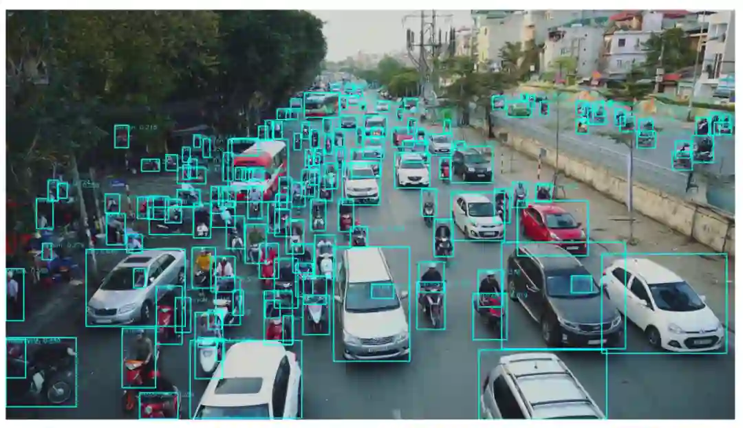 效果很不错,图片中的人与密密麻麻、横七竖八摆放的共享单车大多都检测了出来。接下来我们用一张国内常见的堵车场景来测试一下,车辆、非机动车、行人交错出现在画面中,可以说是非常复杂的场景了。从检测结果可以看出,基本上所有的行人、车辆、背包、袋子等物体都较好地检测了出来。