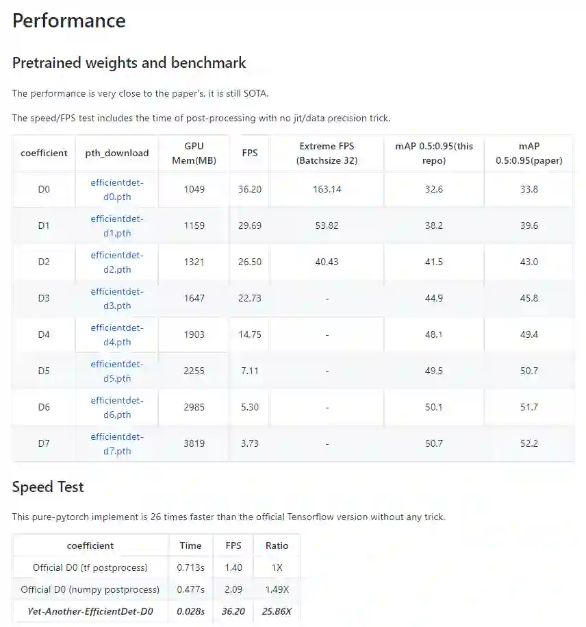 项目作者今年 1 月宅家为国出力时,开始陆续尝试各类 EfficientDet PyTorch 版实现,期间趟过了不少坑,也流过几把辛酸泪。但最终得出了非常不错的效果,也是全网第一个跑出接近论文成绩的 PyTorch 版。