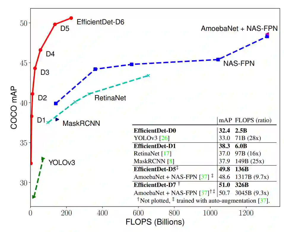 谷歌大脑团队的研究者发现,EfficientNets 的效率超过之前常用的主干网络。于是研究者将 EfficientNet 主干网络和 BiFPN、复合缩放结合起来,开发出新型目标检测器 EfficientDet,其准确率优于之前的目标检测器,同时参数量和 FLOPS 比它们少了一个数量级。