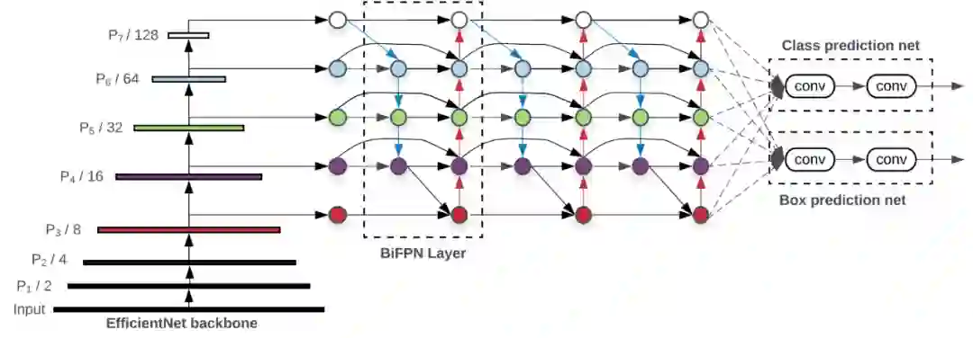 下图展示了 EfficientDet 的整体架构,大致遵循单阶段检测器范式。谷歌大脑团队的研究者将在 ImageNet 数据集上预训练的 EfficientNet 作为主干网络,将 BiFPN 作为特征网络,接受来自主干网络的 level 3-7 特征 {P3, P4, P5, P6, P7},并重复应用自上而下和自下而上的双向特征融合。然后将融合后的特征输入边界框/类别预测网络,分别输出目标类别和边界框预测结果。