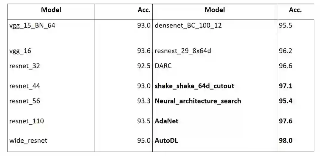 图 4 是一个搜索到的结构,大概是一个 30 层的网络,网络的每层都有具体搜出的操作,大概可以达到 96.5% 的准确度,已经超过大部分的人类专家设计的网络。后来我们做进一步的改进。最新的结果就如图 5 所示,横向对应不同的网络结构,纵向对应它们的准确度,这里面有 VGG,ResNet, and DenseNet 等不同的网络结构。那么人类专家最好的准确度可以达到 97.1%,就是通过 shake_shake_64d_cutout 的方法,应该是在 ResNet 上得到的。Google 最早一版的准确度在百分之九十五点几,在去年的 AdaNet 进一步提高到 97.6%;AutoDL 现在最好的结果是第一版的 98.01%,错误率低于 2%,到现在仍保持最好的记录,也就是说我们基本上保持了 6 个月的准确性,可以跟 Google 正面竞争。