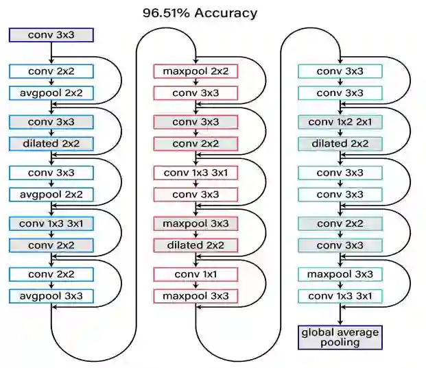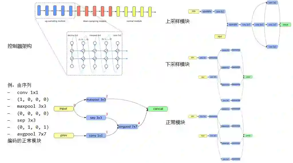 浣军: 这里有几种模式。第一种就是说,结构大体上已经安排好了,就像一个 ResNet,它有 15 层或者 20 层,每一层都有不同的操作,可以是 3×3,也可以是 5×5,skip connection 可以 I 和 I 加 3 之间,或者和 I 加 4 之间,不一定是 I 和 I 加 2 之间,这样就是宏观搜索,这种情况下大体上的结构是知道的。第二种,它有一个叫做模块的概念,搜出来的不是一个 30 层的整个网络,而是一个模块,然后把多个搜索到的模块拼接起来,得到最终的结构。这样它对模块也需要模板,比如说是一个 7 个结点的模块。有这么一个模板,在模板上进行优化,优化完了以后,得到一个模块的结果,再把多个模块拼起来,得到最终的结果。第三种就比较小众一点,就是从 ResNet 开始,进行局部修改,比如将某一层 split 成两层,或者把两层合并成一层,或者把一层的操作换掉,通过这种操作逐渐得到一个比较优化的结果。