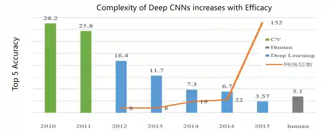 这听起来不太可能,我们看一个例子,大家可能都比较熟悉,横轴是时间,纵轴是错误率,从 2012 年开始,错误率从百分之二十几到百分之十几。当 Deep Learning 出来时,可以看到一下子降了 10%,当时有人打电话说,Hinton 是不是能够事先知道 testing data?你是不是 cheat 了?Hinton 说我干了一辈子了,不能干这种事情。后来 2015 年错误率是 3.57%,为什么 3.57 得出来?人类专家先不说累不累,都是看一百万张图片,差不多是 5% 的错误率,深度学习在感知层面是可以超过人类专家,但在认知层面还没有全面超过人类专家,大家要有一个基本的认识。认知层面包括推理逻辑这些,感知层面至少在图像分类上确实超过人类专家。