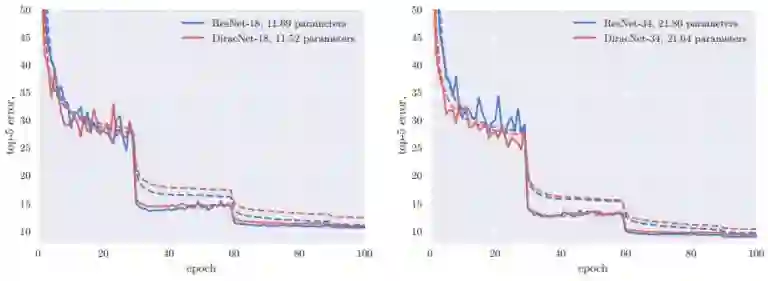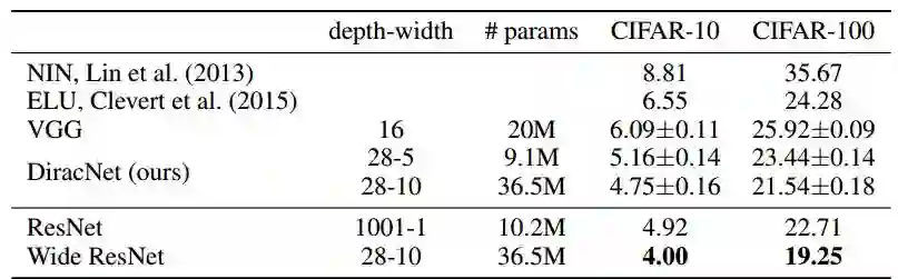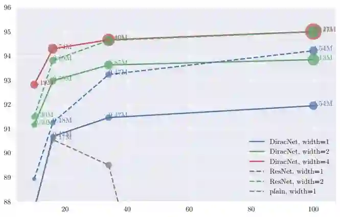 在同等深度的情况下,DiracNets普遍需要更多的参数才能达到和ResNet相当的准确率: