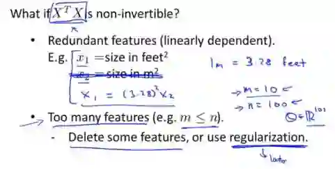 1、可能是众多种类的特征中出现了线性相关的特征(如下,对于面积,用米作为单位以及英尺作为单位的x1与x2同时出现在特征中,这时就可能出现矩阵不可逆的情况)。