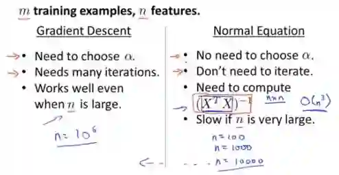 对于n的值对算法选择的影响,课程中给出它的经验是10000以后会考虑使用梯度下降法或者其它的算法。
