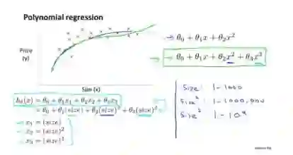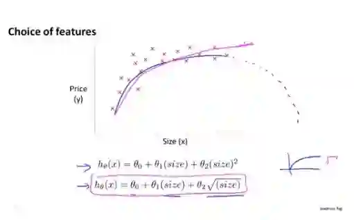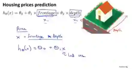 同样是房价预测的例子,如下图所示,对于房价的预测由两个特征决定,即临街宽度(frontage)与纵向深度(depth),根据经验可知,这两个特征可以用一个特征面积来表示(即临街宽度与纵向深度的乘积)。所以预测函数写成。