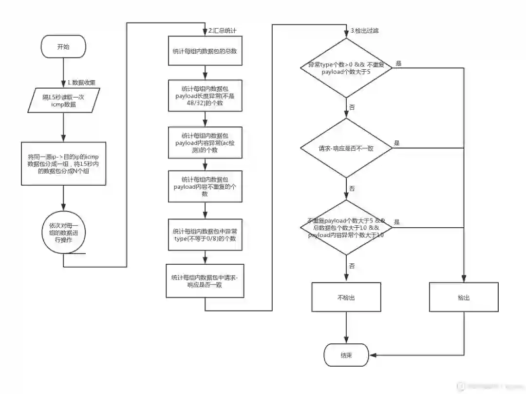 鉴于Icmp隧道特点的多样性,只要满足3者之一,就会检出,对于一些极端异常的ICMP隧道产生的包,比如隧道只有请求包没有响应包即一直往外发数据,则id_seq去重后为10(10次全是请求包,且seq递增),payload去重后为10,无法单独通过2检出,但是可以满足3,一样会检出,不会漏报。