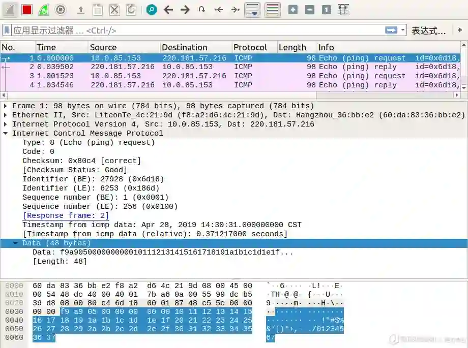 因此,正常操作系统下通过ping产生的data,转换为16进制后为从00开始不断递增然后一直到ff的重复序列中的一段或几段。