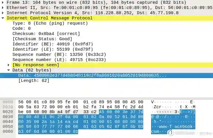 对于icmp隧道产生的自定义data数据包,转换为16进制后内容是乱序没有规律的,比如构造一个内容为R5*êÍwwwfacebookcom字符串的自定义data的包,其16进制内容为: