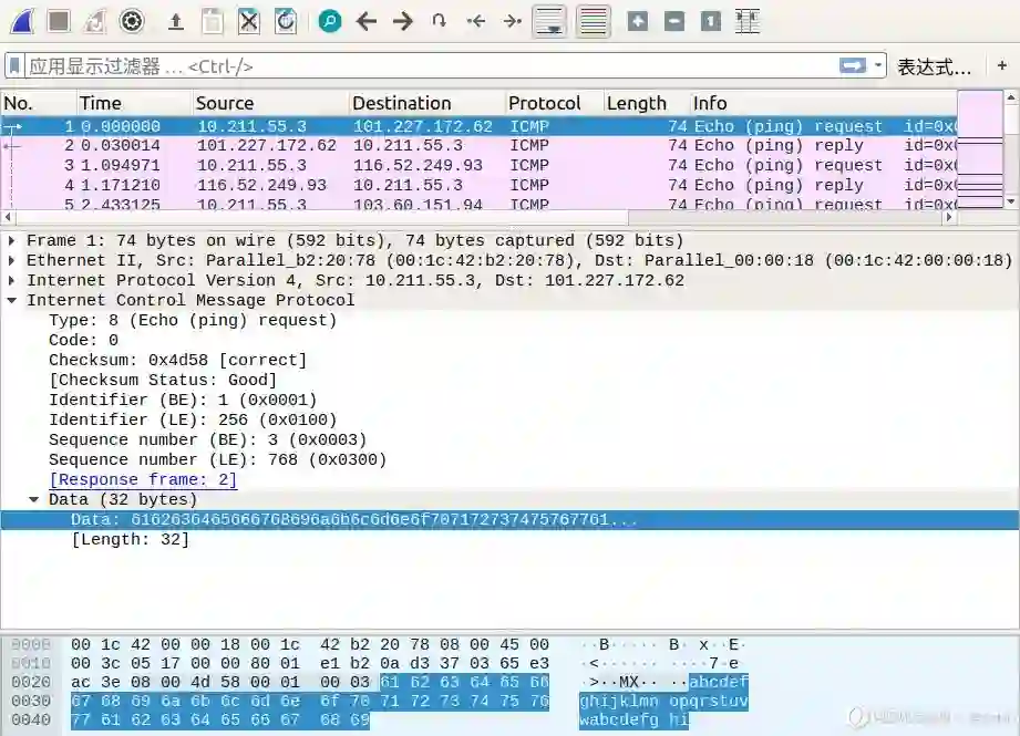 3. 序号相同的ICMP数据包应当属于一对ICMP请求响应消息,他们的payload是否一致;