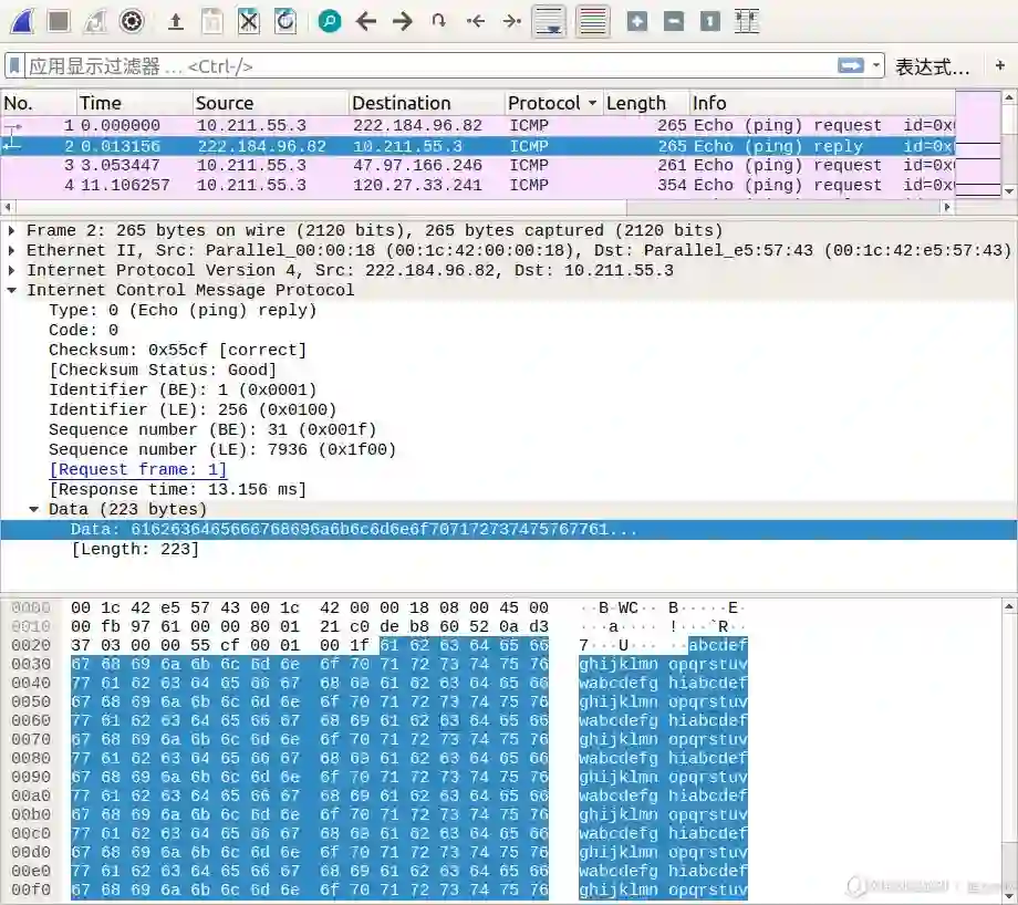 此外,ping的包大小,也就是data大小是可以修改的,以windows为例,使用ping baidu.com -l 223,修改为223bytes,从包体内容来看,规律还是一样,就是重复罢了,如图4所示: