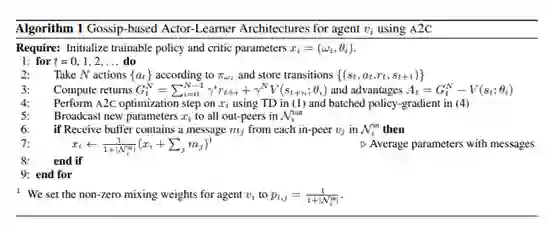 多模拟器培训通过稳定学习和提高培训吞吐量,为最近深度强化学习的成功做出了贡献。作者提出了基于Gossip的Actor-Learner Architectures(GALA),其中几个演员学习者(如A2C代理人)以对等通信拓扑结构组织,并通过异步八卦交换信息以利用大量分布式模拟器。并证明在使用松散耦合的异步通信时,GALA代理在训练期间保持在一个ε-球之间。通过减少代理之间的同步量,与A2C(其完全同步的对应物)相比,GALA在计算上更有效且可扩展。GALA也优于A2C,更加强大,样品效率更高。最后作者展示了可以在单个GPU上并行运行几个松散耦合的GALA代理,并且在可比功耗方面实现了比朴素A2C更高的硬件利用率和帧速率。