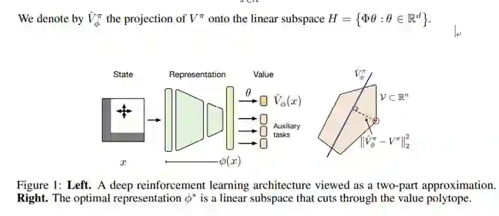 本文是一篇由DeepMind, GoogleBrain,牛津大学等共同发表的文章,作者基于价值函数空间的几何性质,提出了强化学习中表征学习的新视角。其利用这种观点提供关于价值函数作为辅助任务的有用性的正式证据。并表述考虑调整表示以最小化给定环境的所有固定策略的值函数的(线性)近似,这种优化减少了对一类特殊值函数的准确预测,他们将其称为对抗值函数(AVF)。结果证明使用值函数作为辅助任务对应于我公式的预期误差放宽,AVF是一个自然的候选者,并确定与原始值函数的密切关系, 其强调了AVF的特征及其在四室域系列实验中作为辅助任务的实用性。