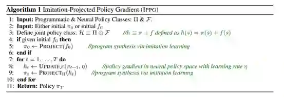 作者提出了模仿预测策略梯度(IPPG),这是一种用于学习策略的算法框架,这些策略以结构化编程语言简洁地表示。与神经政策相比,此类计划政策可以更具解释性,可推广性,并且易于进行形式验证;然而,为计划政策设计严格的学习方法仍然是一项挑战。IPPG,作者对这一挑战的回应,基于三个见解。首先,他将学习任务视为策略空间中的优化,模拟所需策略具有编程表示的约束,并使用“提升和项目”视角解决此优化问题,该视角采用渐变步骤进入无约束策略空间然后投射到受约束的空间。其次,将无约束的政策空间视为混合神经和程序化表示,这使得能够采用最先进的深度政策梯度方法。第三,通过模仿学习将投射步骤作为程序综合,并利用当代组合方法完成这项任务。最后提出了IPPG的理论收敛结果,以及三个连续控制域的经验评估。实验表明,IPPG可以明显优于现有技术