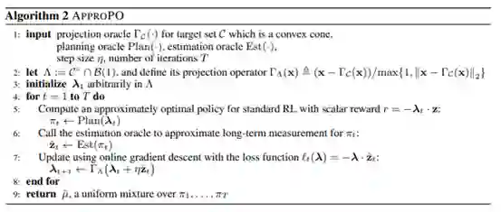 在标准强化学习(RL)中,学习智能体寻求优化整体奖励。然而,期望行为的许多关键方面更自然地表达为约束。例如,设计者可能想要限制不安全动作的使用,增加轨迹的多样性以实现探索,或者在奖励稀疏时近似专家轨迹。在本文中,作者提出了一种算法方案,可以处理RL任务中的一大类约束:具体而言,任何需要某些向量测量的期望值(例如使用动作)的约束都位于凸集中。这捕获了先前研究的约束(例如安全性和与专家的接近度),但也实现了新的约束类(例如多样性)。作者的方法具有严格的理论保证,并且仅依赖于近似解决标准RL任务的能力。因此,它可以很容易地适用于任何无模型或基于模型的RL。在实验中,结果表明它匹配以前通过约束强制实施安全性的算法,但也可以强制执行这些算法不包含的新属性,例如多样性。