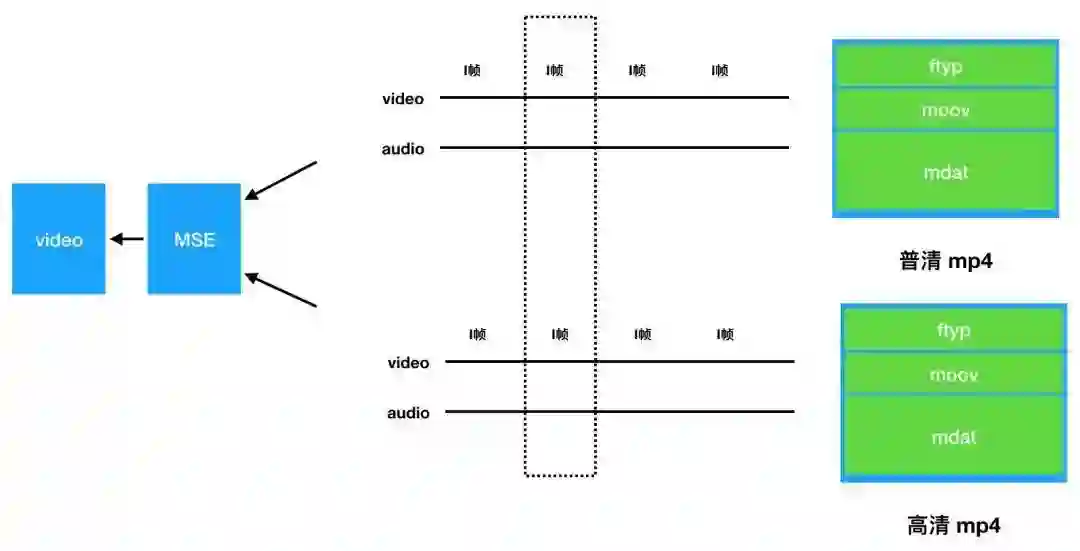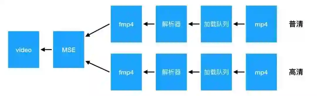 上面两点搞清楚之后我们就该说下清晰度切换的事情了。这个需求大家都不陌生,但是直接使用 mp4 格式做无缝清晰度切换,难度还挺大的。先解释下“无缝清晰度切换”的概念:从播放一个分辨率的视频到另一个分辨率且保证画面、声音不停顿的平滑切换过程。了解了这个概念,大家应该知道了用 video 无缝切换 mp4 有多难。一方面,video 是不支持流式的视频格式的,一方面,video 的加载是不受JS控制的。通过切换 video 的 src 属性,必然会导致画面中断、重新请求视频数据等。有的同学想到说利用两个 video 再结合 z-index 来搞,但是当你生成另一个video去加载视频的时候,无法保证两个画面是严格一致的,即使将原来的画面暂停到一个时刻,用另一个视频通过 currentTime 属性与之同步,切换仍然看到画面闪烁,基本无法和 Youtube 无缝切换的体验匹敌。而且还会造成更多流量的浪费,背后的原因大家可以研究下 mp4 容器和 webm 容器的异同,也可以看下视频解码相关的文章。