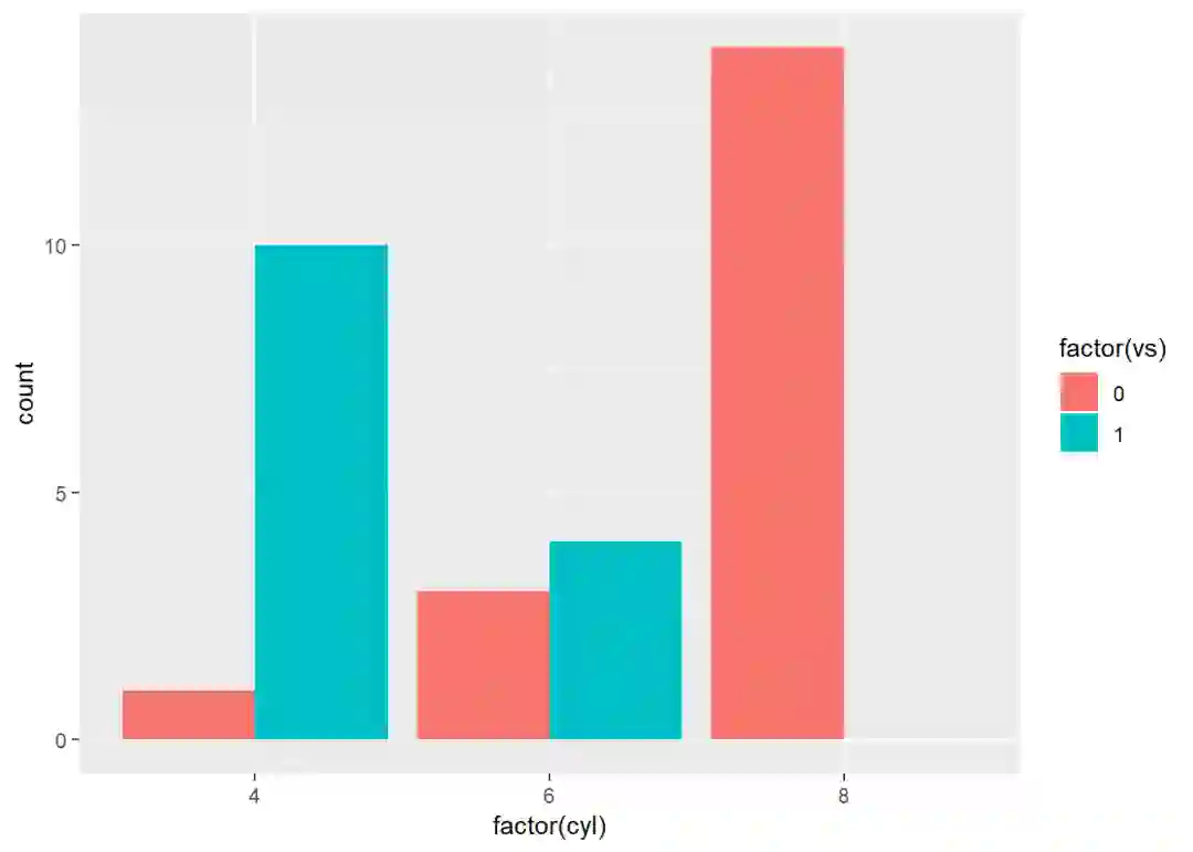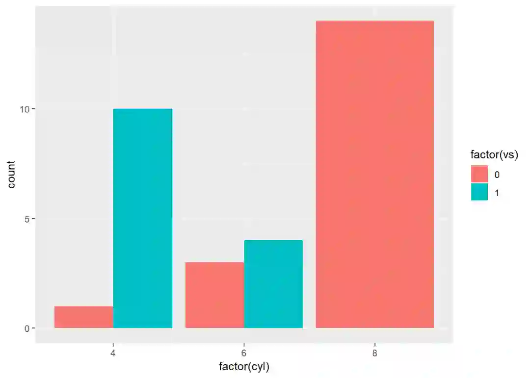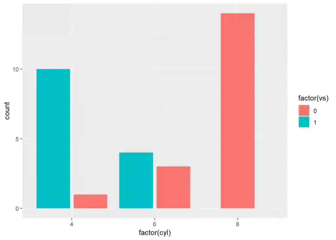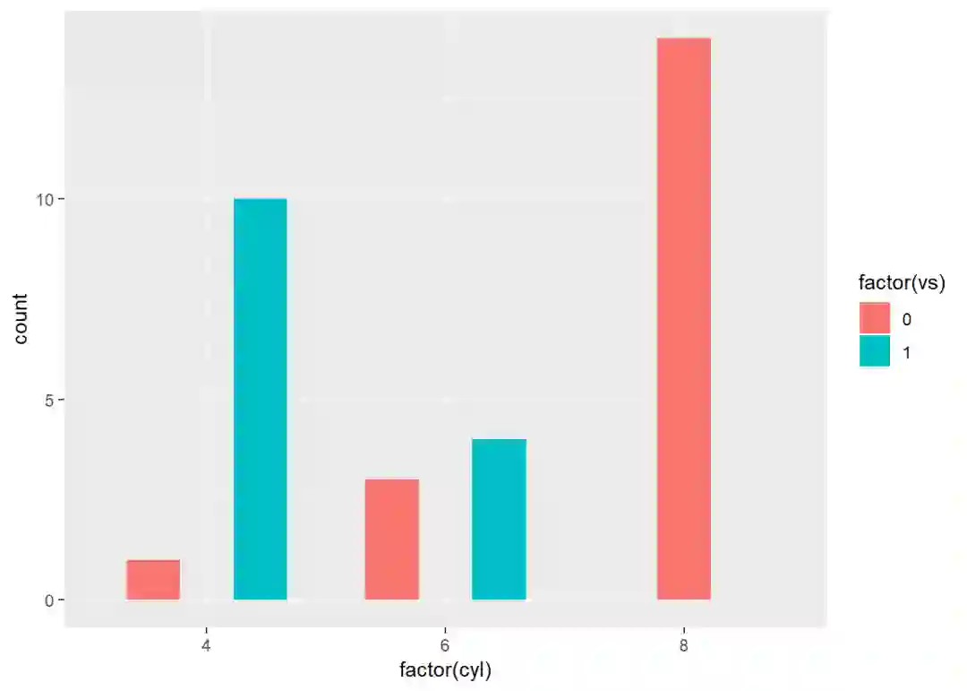 ggplot(mtcars, aes(factor(cyl), fill = factor(vs))) + geom_bar(position = "dodge2") # 水平并列柱形图,默认保留所有柱子