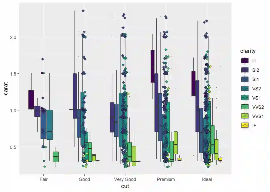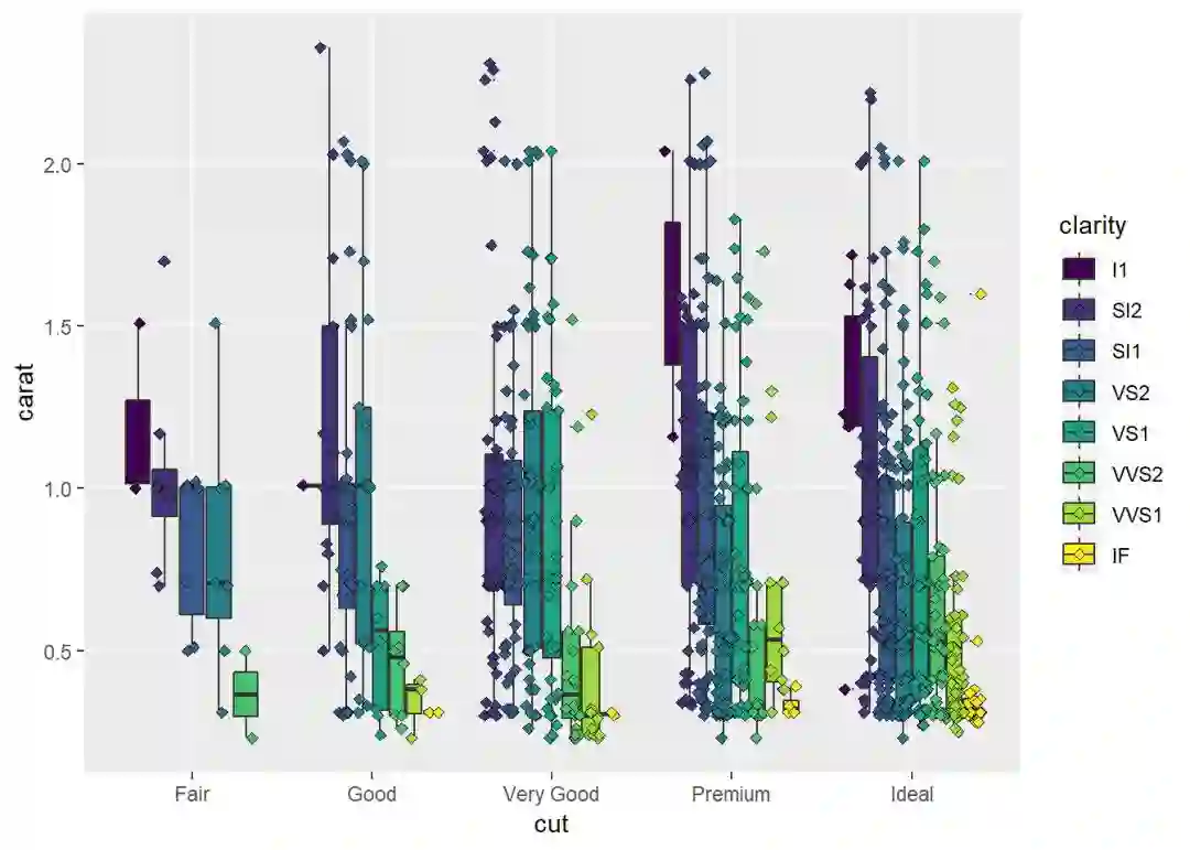 geom_point(shape = 23, position = position_jitterdodge(dodge.width = 0.8)) # 点分布于各组箱子80%宽度上,默认点水平抖动错开