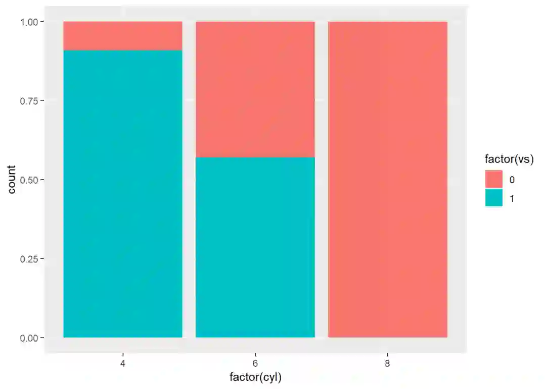 ggplot(mtcars, aes(factor(cyl), fill = factor(vs))) + geom_bar(position = "fill") # 百分比堆积