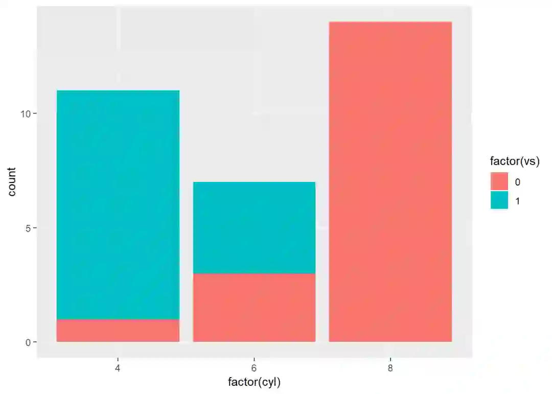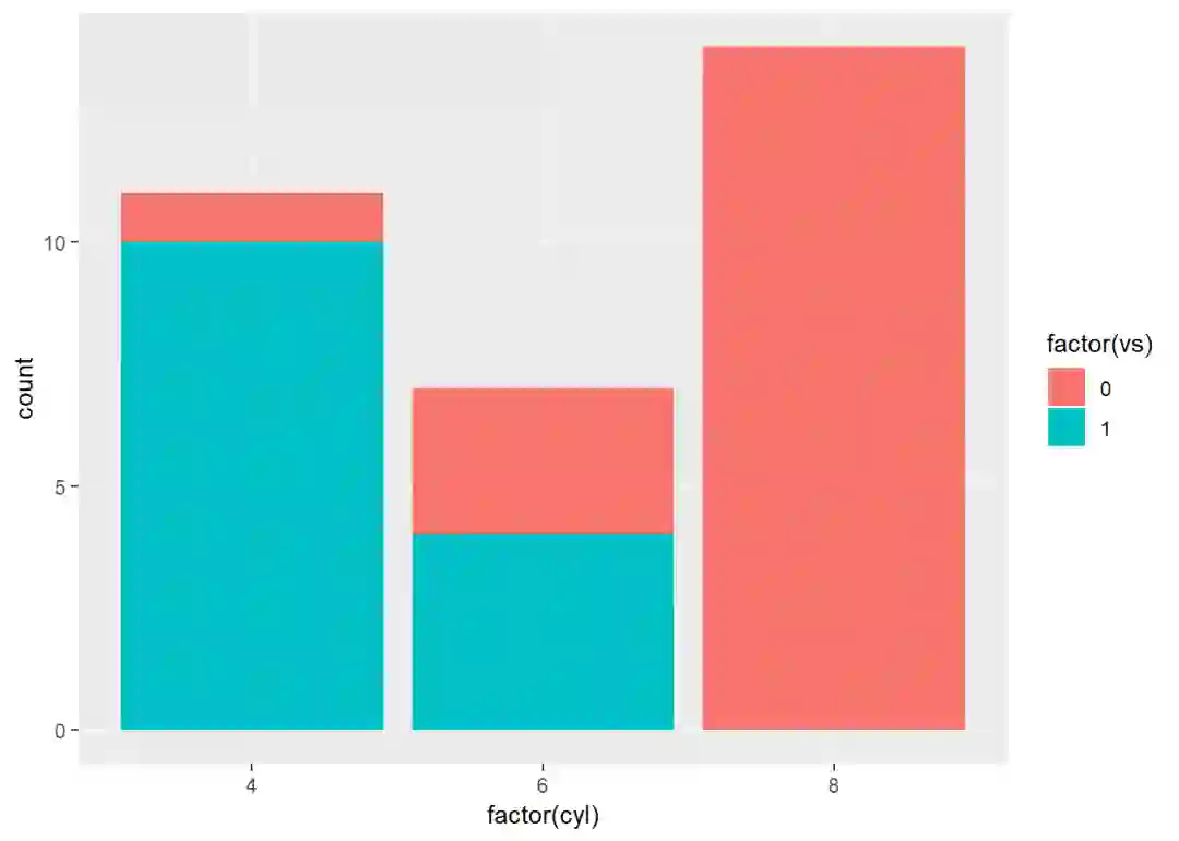 ggplot(mtcars, aes(factor(cyl), fill = factor(vs))) + geom_bar() # 柱形图默认stack堆积