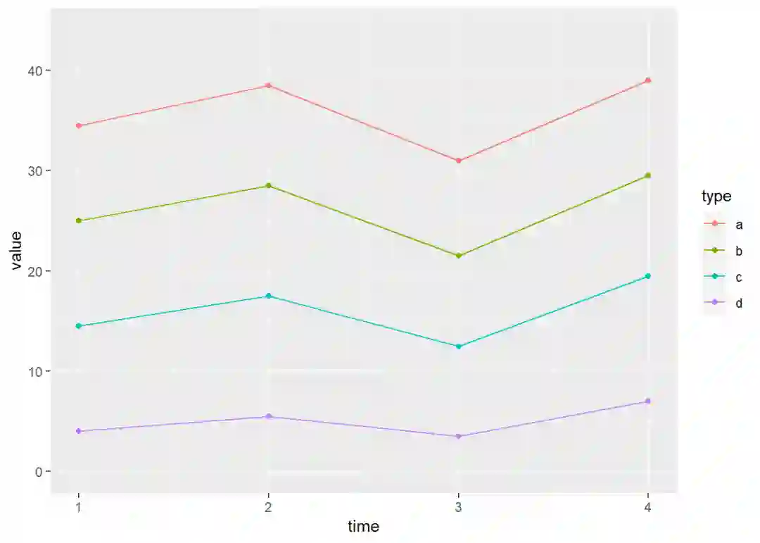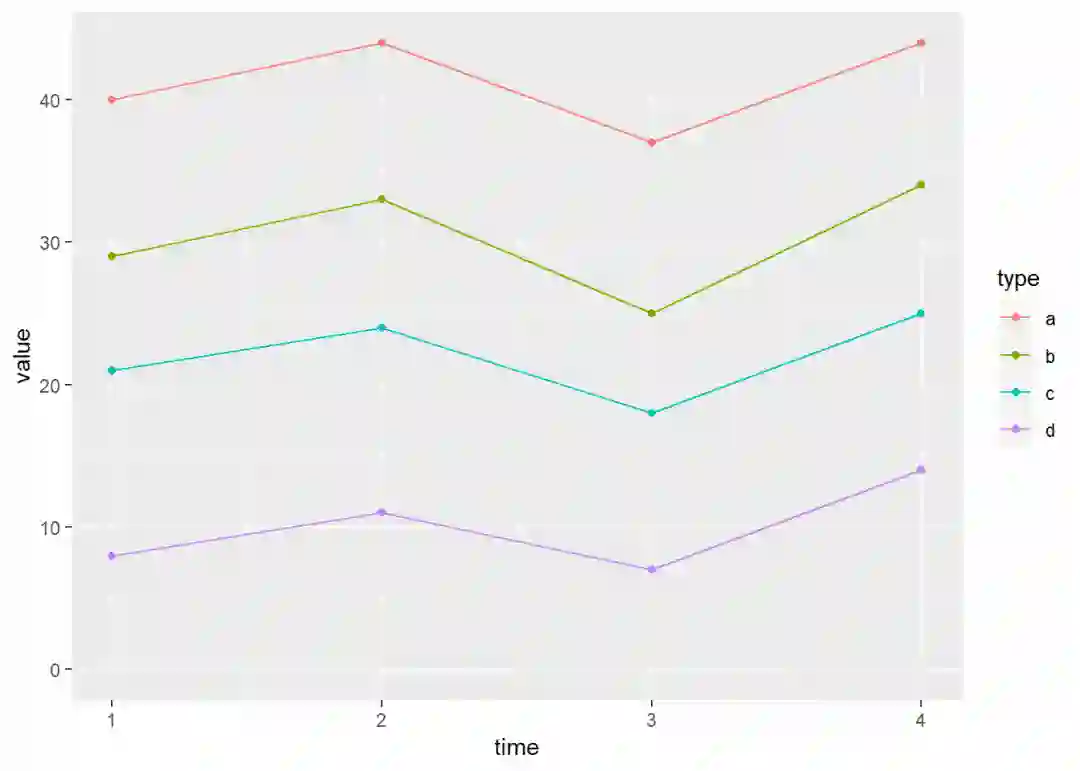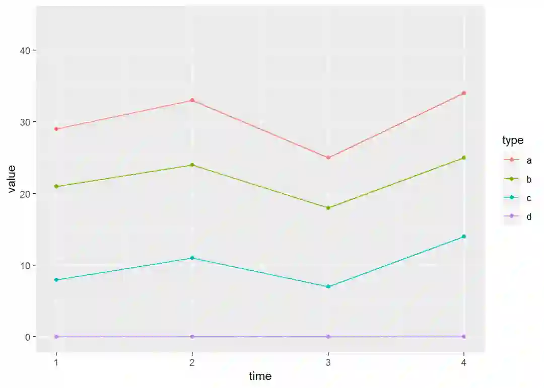 position = position_stack(vjust = 0)) + geom_point(aes(colour = type), position = position_stack(vjust = 0)) # 向下移动到底,最下面的折线都拉直了