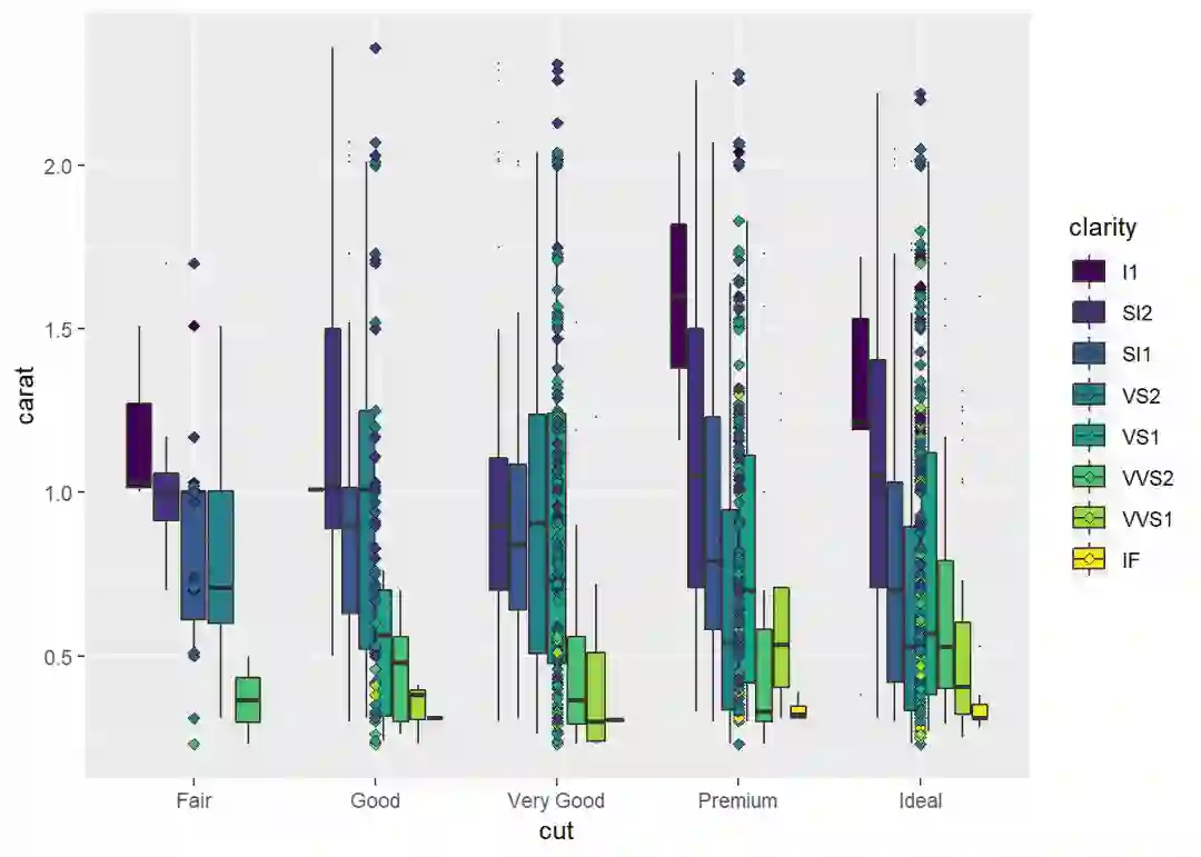 ggplot(dsub, aes(x = cut, y = carat, fill = clarity)) + geom_boxplot(outlier.size = 0) +