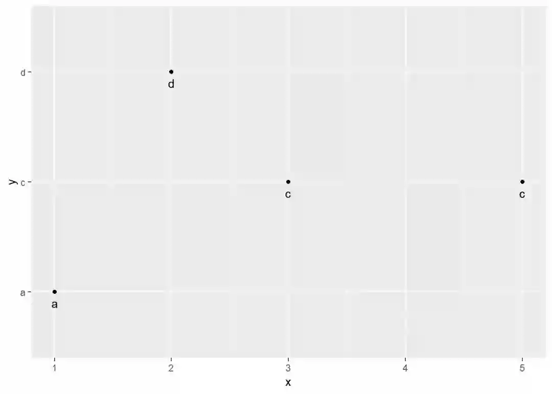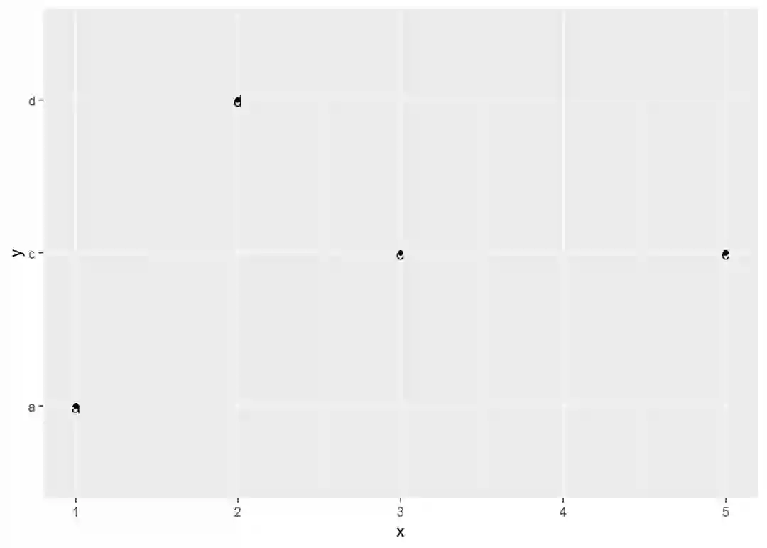ggplot(df, aes(x, y)) + geom_point() + geom_text(aes(label = y)) # 文本对象位置与点重合,视觉效果不好