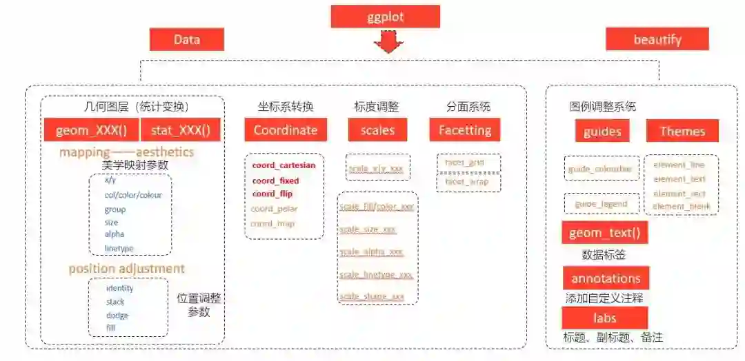 有明确的起始(ggplot开始)与终止(一句话一个图层),图层之间的叠加是靠“+”实现的,越往后,其图层越在上方