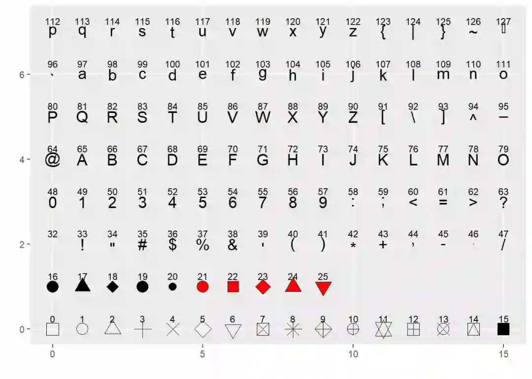 ggplot() + scale_y_continuous(name = "") + scale_x_continuous(name = "") + scale_shape_identity() +