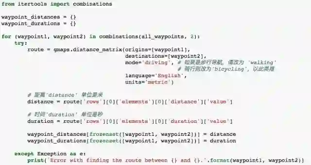 接下来,我们将查询 Google Maps API,寻找所有路标之间的最短路线。 这相当于在 Google 地图网站上进行 Google 地图路线查询,只是现在我们正在使用代码自动执行数百次查询。
