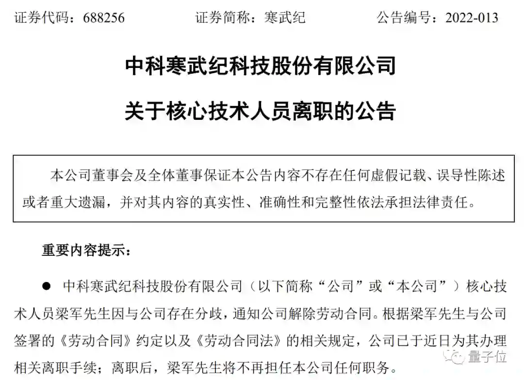 因为这则公告官宣的是:公司核心技术骨干、CTO梁军,离职。