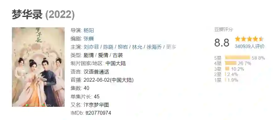 与此同时,这部剧在豆瓣的评分更是从开画 8.3 分一路飙升到 8.8 分,要知道曾经的神剧《甄嬛传》,也才 9.3 分。