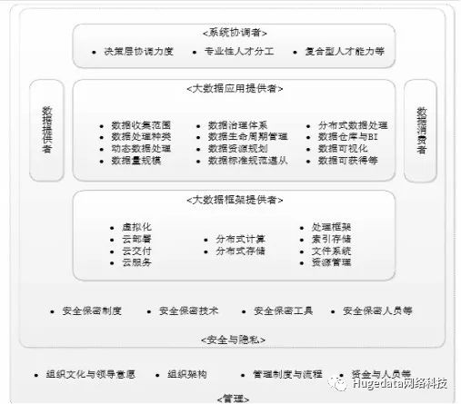 五个主要的模型构件代表在每个大数据系统中存在的不同技术角色:系统协调者、数据提供者、大数据应用提供者、大数据框架提供者和数据消费者。另外两个非常重要的模型构件是安全隐私与管理,代表能为大数据系统其他五个主要模型构件提供服务和功能的构件。这两个关键模型构件的功能极其重要,因此也被集成在任何大数据解决方案中。