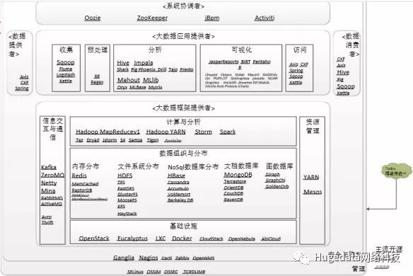 通过研究收集大数据生命周期中各环节(提供、收集、存储、预处理、分析挖掘、可视化、访问、消费等)的众多开源软件,结合大数据标准参考架构的构件层级分类法和价值链维度,我们总结并制作了大数据开源软件分布图,如图所示。该分布图一方面体现了这些开源软件的分类及其对大数据参考架构的影响;另一方面,也为企业在构建遵循大数据标准的大数据应用系统时可以方便地找到并选择适合的开源软件。