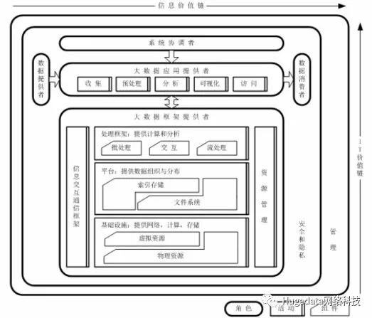 大数据参考架构图的整体布局按照代表大数据价值链的两个维度来组织,即信息价值链(水平轴)和IT价值链(垂直轴)。在信息价值链维度上,大数据的价值通过数据的收集、预处理、分析、可视化和访问等活动来实现。在IT价值链维度上,大数据价值通过为大数据应用提供存放和运行大数据的网络、基础设施、平台、应用工具以及其他IT服务来实现。大数据应用提供者处在两个维的交叉点上,表明大数据分析及其实施为两个价值链上的大数据利益相关者提供了价值。