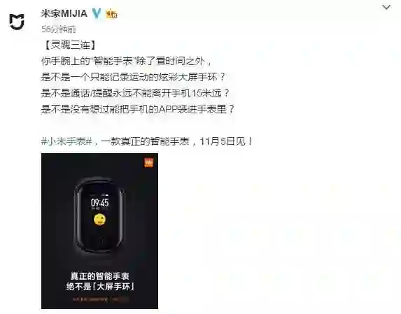 今日上午,米家MIJIA官方在微博上宣布,11月5日小米手表将与小米CC9 Pro一同发布,随后在另一条预热微博中,官方称真正的智能手表,绝不是“大屏手环”,并暗示小米手表可能支持安装手机App。
