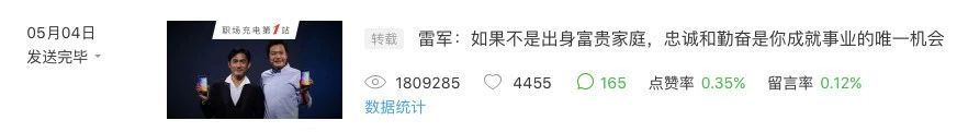 2018年5月4日,发表《雷军:如果不是出身富贵家庭,忠诚和勤奋是你成就事业的唯一机会》,阅读量180万,点赞4455;