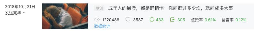 2018年10月21日,发表《成年人的崩溃,都是静悄悄:你能挺过多少坎,就能成多大事》,阅读量122万,点赞3587。