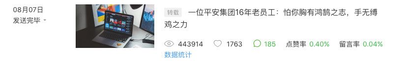 2018年8月7日,发表《一位平安集团16年老员工:怕你胸有鸿鹄之志,手无缚鸡之力》,阅读量44万,点赞1763;
