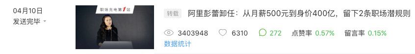 2018年4月10日,发表《阿里彭蕾卸任:从月薪500元到身价400亿,留下2条职场潜规则》,阅读量340万,点赞6310,带来粉丝近10万;